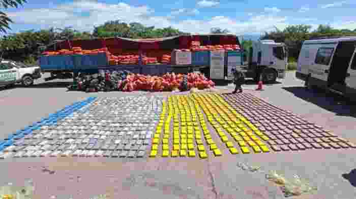 Tras las inspecciones, constataron que entre las bolsas de mercadería había ocultos 31 bultos con paquetes rectangulares tipo "ladrillos", con un total de 861 kilos 950 gramos de cocaína, que fueron decomisados. En el procedimiento, detuvieron a tres personas.