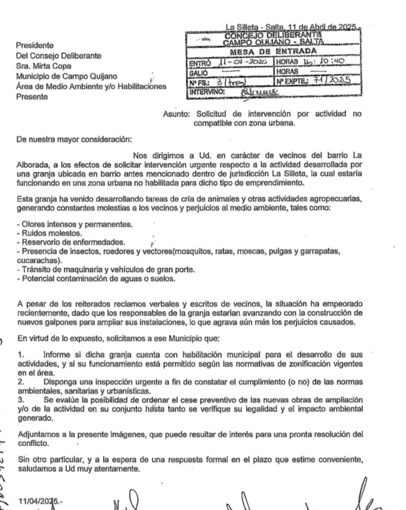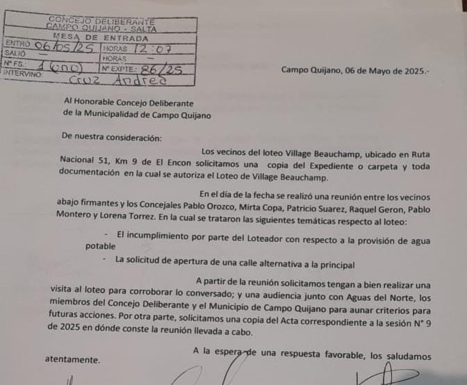 - Notas de vecinos de Village Beauchamp (por agua potable y apertura de calle) y de La Alborada (por situación con una granja).