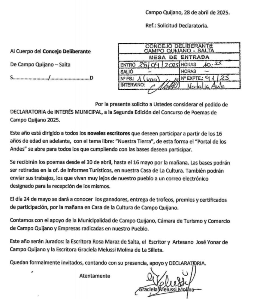 - Solicitud de Declaratoria de Interés Municipal para la Segunda Edición del Concurso de Poemas de Campo Quijano 2025.