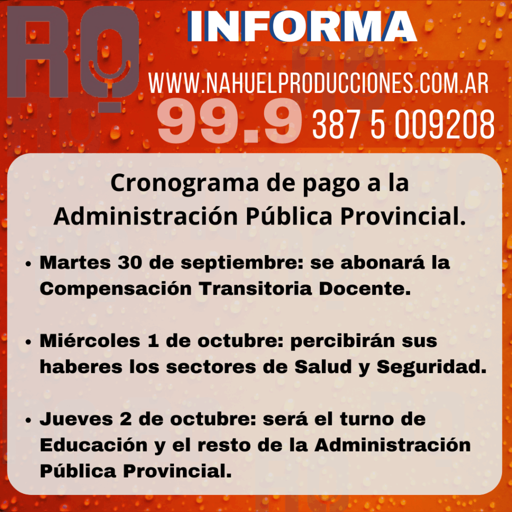 El Gobierno de la Provincia dio a conocer el cronograma de pago de sueldos correspondiente al mes de septiembre de 2025.