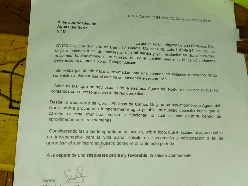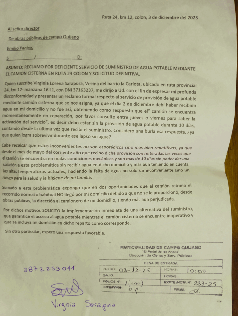 Mientras tanto, las notas de reclamo se presentan, se sellan, se archivan. Una vecina, cansada pero firme, viene elevando quejas formales al intendente por la falta de provisión de agua en la zona. No pide una pileta climatizada, no pide lujos: pide agua. Agua para cocinar, para higienizarse, para que los chicos vayan a la escuela limpios, para que los adultos mayores no dependan de la caridad o de la buena voluntad de un vecino con vehículo.