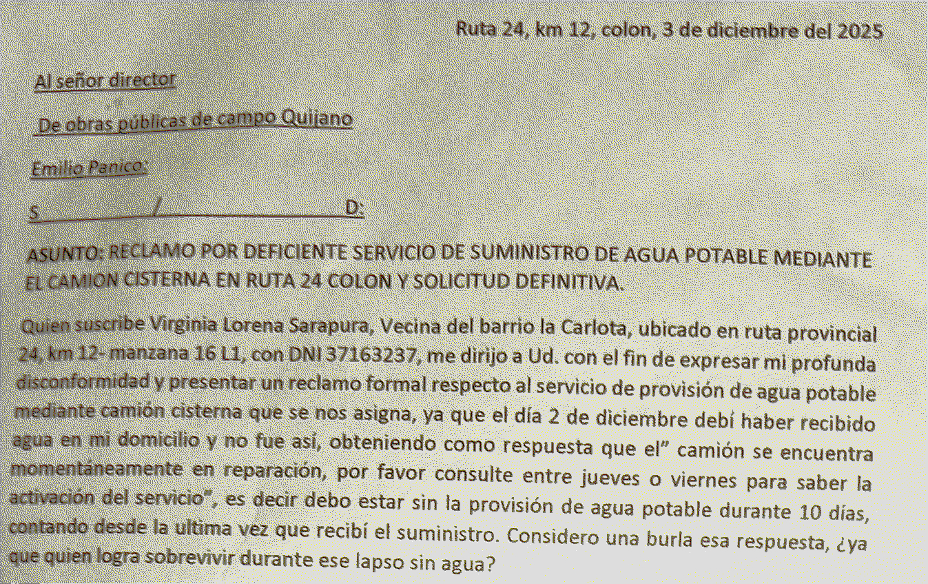 Mientras tanto, las notas de reclamo se presentan, se sellan, se archivan. Una vecina, cansada pero firme, viene elevando quejas formales al intendente por la falta de provisión de agua en la zona. No pide una pileta climatizada, no pide lujos: pide agua. Agua para cocinar, para higienizarse, para que los chicos vayan a la escuela limpios, para que los adultos mayores no dependan de la caridad o de la buena voluntad de un vecino con vehículo.