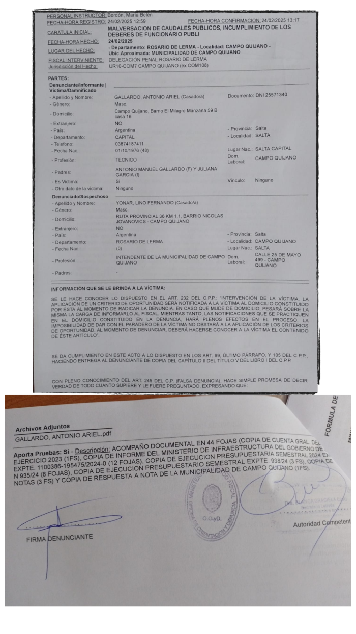 En la jornada de hoy, 24 de febrero de 2025, el exconcejal Ariel Antonio Gallardo denunció penalmente al intendente de Campo Quijano, Ingeniero Lino Fernando Yonar, por los presuntos delitos de malversación de caudales públicos e incumplimiento de los deberes de funcionario público.
