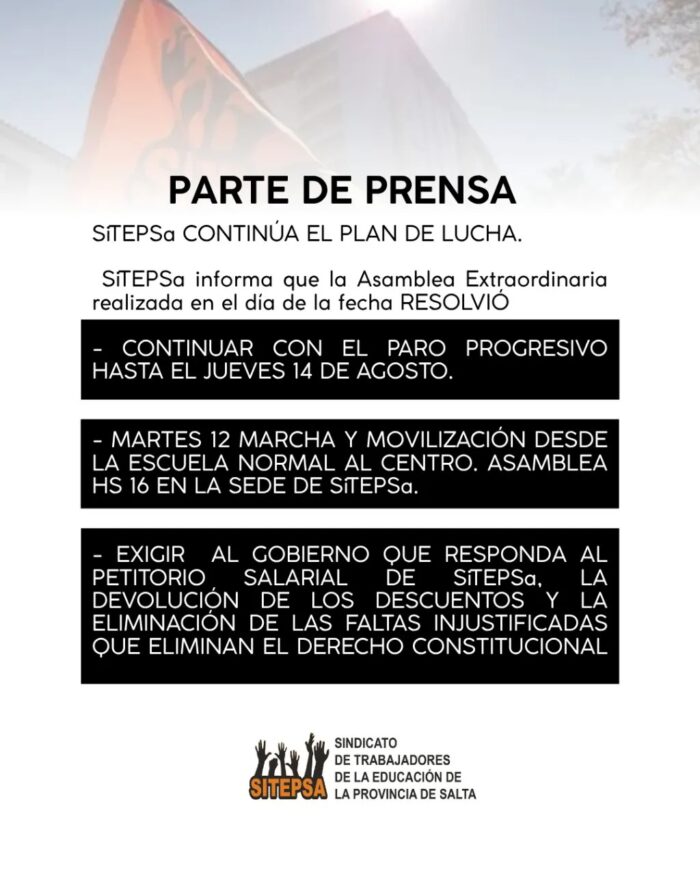 La secretaria general del Sindicato de Trabajadores de la Educación de la Provincia de Salta (SITEPSa), María Victoria Cervera, confirmó en diálogo con Radio Quijano que la Asamblea realizada el pasado sábado resolvió por unanimidad continuar con el plan de lucha, con un paro progresivo hasta el jueves 14 de agosto.