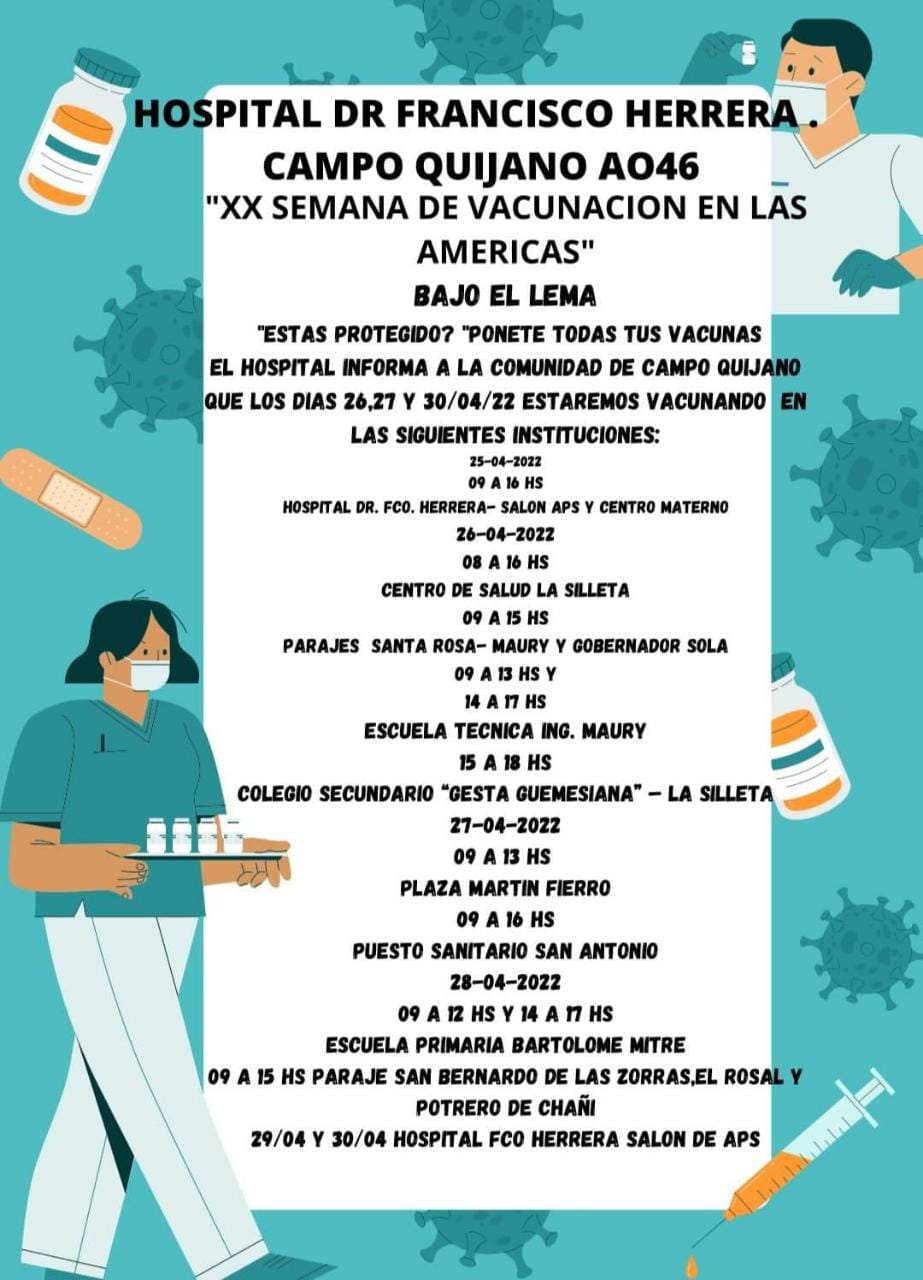 Bajo el lema: ESTÁS PROTEGIDO? PONETE TODAS TUS VACUNAS, el hospital informó que los días 26, 27 y 30 de abril estarán vacunando en las siguientes instituciones: