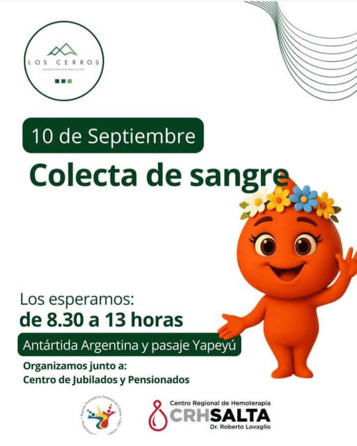 La colecta se hará entre las 8.30 y las 13, en el Centro de Jubilados y Pensionados “Portal de los Andes”, ubicado en calle Antártida Argentina esquina Yapeyú. Se solicita a los donantes concurrir con documento de identidad y no estar en ayunas. También, hidratarse suficientemente.