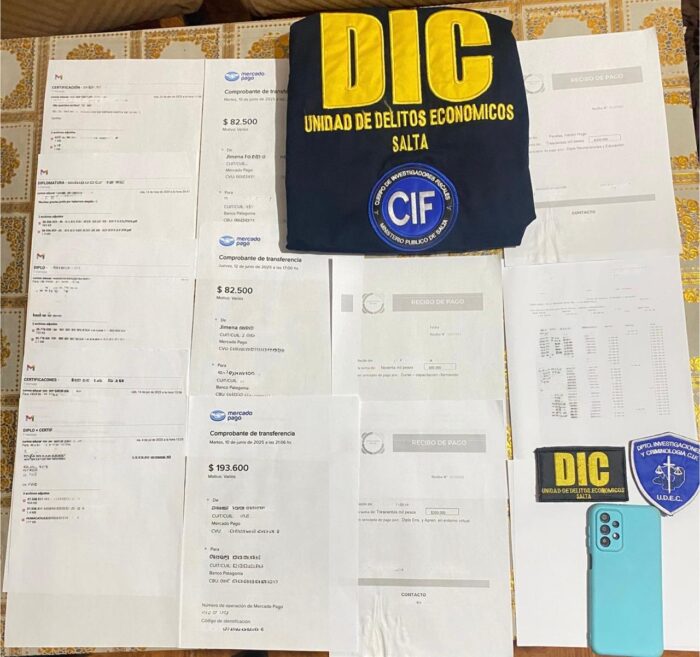 Las tres personas investigadas actuaban una en el norte, otra en el sur provincial y un hombre en San Carlos de Bariloche. Una de ellas es una docente y preceptora de un colegio secundario de Joaquín V. González, con domicilio en Coronel Mollinedo, quien cumplía el rol de captación y nexo territorial en el distrito sur. Operaba bajo el contacto “Prof. Vende Diplomaturas”, ofrecía títulos sin cursado y con calificaciones asignadas, y recibía los pagos en cuentas a su nombre.
