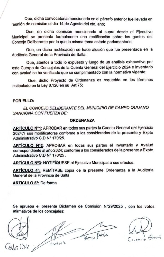 - Dictamen N°29/2025 (21/08/2025): aprobación total de la Cuenta General del Ejercicio 2024.