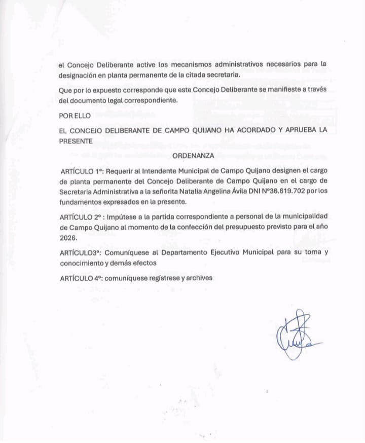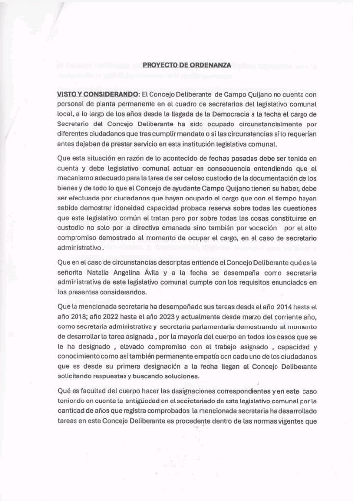 Durante la Trigésima Primera Sesión Ordinaria del Concejo Deliberante de Campo Quijano, el concejal Carlos “Lupi” Cruz presentó un proyecto de ordenanza solicitando al intendente Lino Yonar que designe en planta permanente a la Srta. Natalia Ávila, actual secretaria administrativa del cuerpo legislativo.