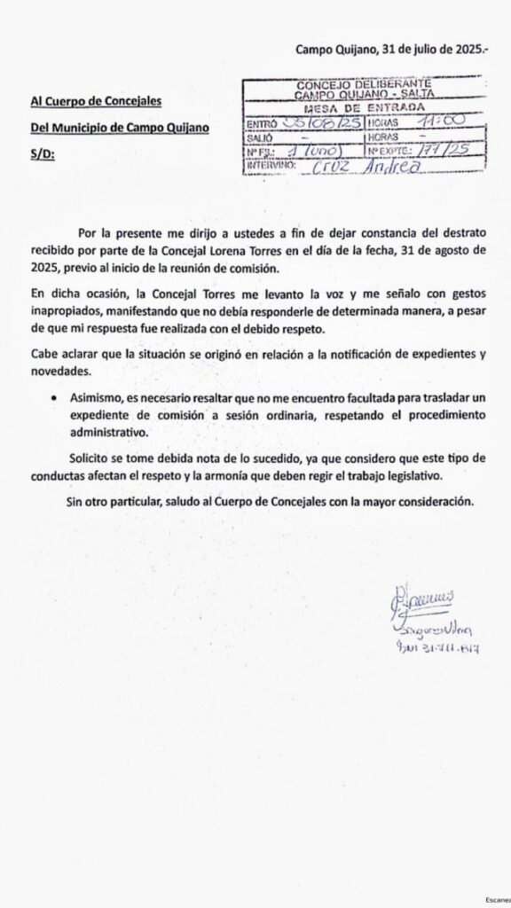 En un contexto de creciente tensión política dentro del Concejo Deliberante de Campo Quijano, en la sesión ordinaria del 5 de agosto se resolvió, por mayoría de votos, remover a la concejal Lorena Torres como presidenta de las reuniones de comisión, a raíz de una serie de notas presentadas por la secretaria parlamentaria y por el personal administrativo del cuerpo legislativo.