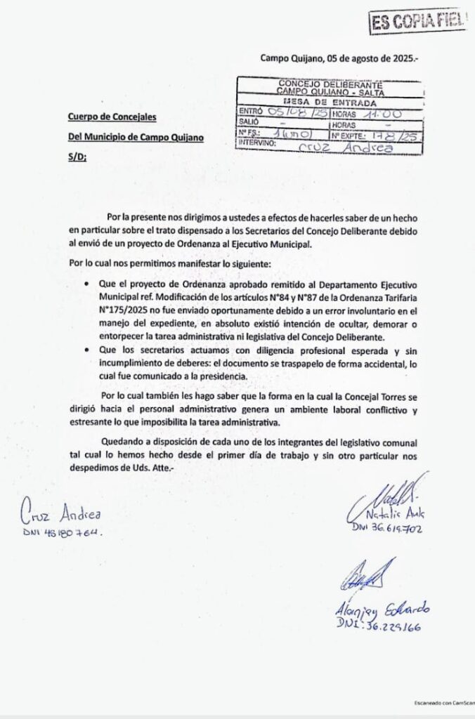 Entre los puntos más delicados, los secretarios reconocen en su nota que hubo un error administrativo en el manejo de un expediente, correspondiente a una ordenanza tarifaria que debía ser enviada al Ejecutivo Municipal, pero aseguran que «no existió intención de ocultar ni entorpecer el trabajo». Sin embargo, atribuyen a la concejal Torres un modo de dirigirse que habría impactado negativamente en la tarea administrativa.