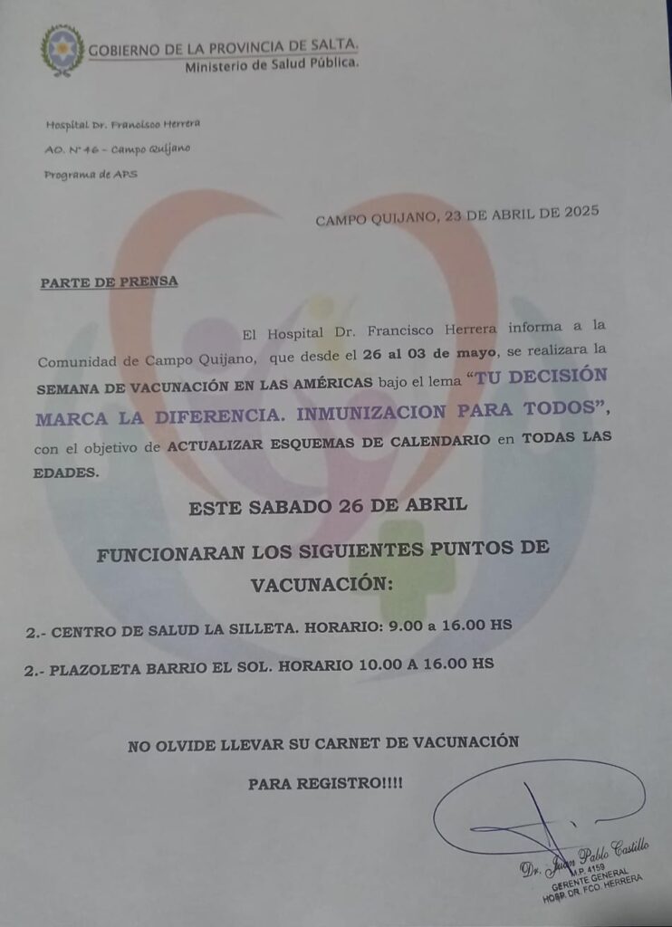 El gerente general del hospital, Dr. Juan Pablo Castillo, informó a Radio Quijano que se instalarán dos puntos de vacunación en el área operativa: