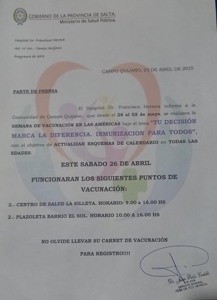 En el marco de la Semana de Vacunación en las Américas 2025, que se celebra del 26 de abril al 3 de mayo por iniciativa de la Organización Panamericana de la Salud (OPS), el Hospital Dr. Francisco Herrera llevará adelante una jornada especial este sábado 26 de abril con el objetivo de promover el acceso equitativo a las vacunas y actualizar esquemas de vacunación en todas las edades.