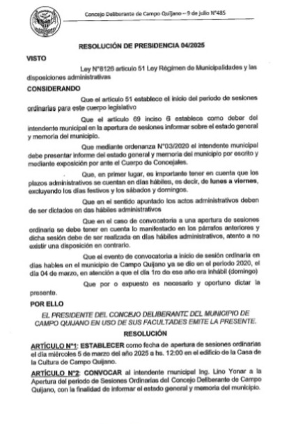 La Ley N.º 8126 de la Provincia de Salta establece con claridad que el período de sesiones ordinarias de los Concejos Deliberantes es del 1 de marzo al 30 de noviembre . Como esta disposición está establecida por una ley provincial, una resolución de presidencia del Concejo Deliberante no puede modificar la fecha de inicio de sesiones, ya que estaría contraviniendo una norma de jerarquía superior.