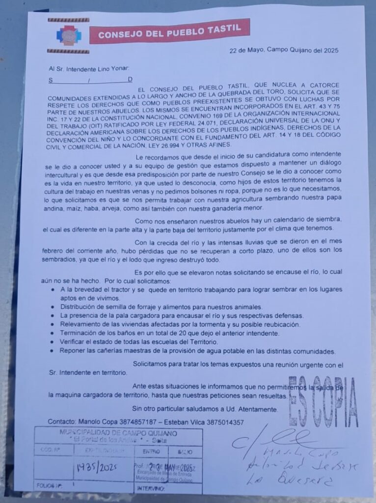 El Consejo, que representa a 14 comunidades originarias distribuidas a lo largo y ancho de la Quebrada del Toro, hizo público un comunicado dirigido al intendente de Campo Quijano, Lino Yonar, exigiendo el cumplimiento de derechos consagrados en la Constitución Nacional, tratados internacionales y leyes vigentes que protegen a los pueblos preexistentes.