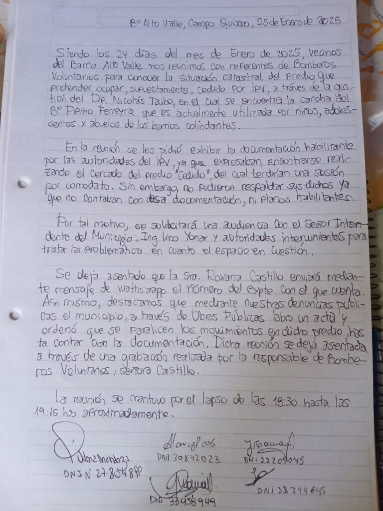 Siendo los 24 días del mes de Enero de 2025, vecinos del Barrio Alto Valle nos reunimos con referentes de Bomberos Voluntarios para conocer la situación catastral del predio que pretenden ocupar, supuestamente, cedido por IPV, a través de la gestión del Dip. Nicolás Taibo, en el cual se encuentra la cancha del Bº Pipino Ferreyra que es actualmente utilizada por niños, adolescentes y abuelos de los barrios colindantes.