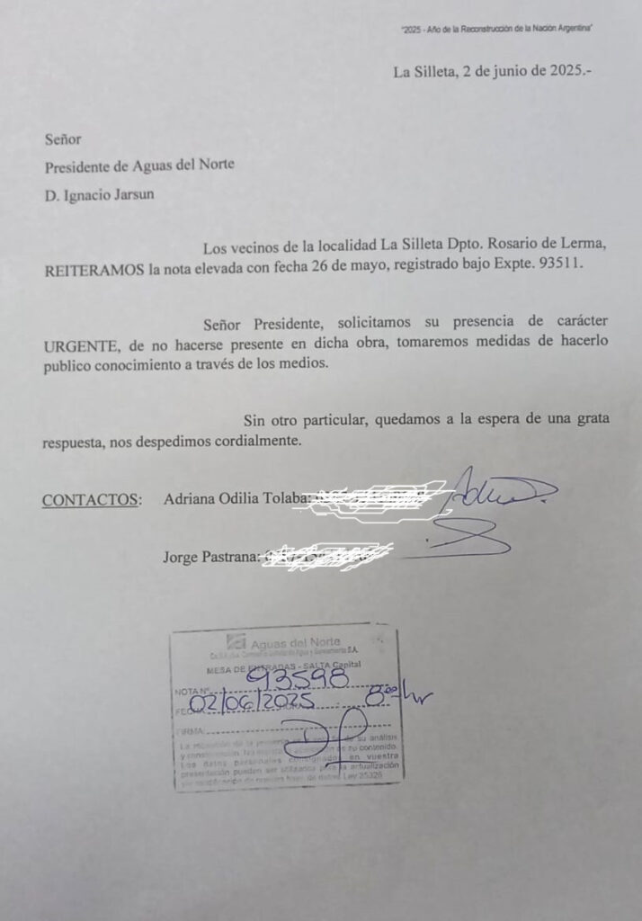 La nota, fechada este 2 de junio, va dirigida al Presidente de Aguas del Norte, Ignacio Jarsún, y reitera el pedido elevado el pasado 26 de mayo, registrado bajo expediente Nº 93511. En el documento, la comunidad solicita la presencia urgente del funcionario en el lugar de la obra, advirtiendo que, de no concretarse una respuesta en el corto plazo, tomarán medidas para hacer pública la situación a través de los medios de comunicación.