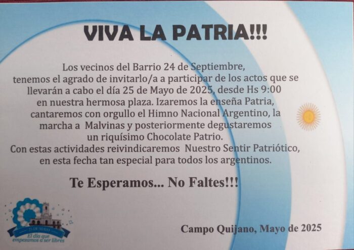 Con gran entusiasmo y espíritu patriótico, los vecinos del Barrio 24 de Septiembre invitan a toda la comunidad a participar de los actos conmemorativos por un nuevo aniversario de la Revolución de Mayo. Las actividades se desarrollarán el próximo domingo 25 de mayo de 2025, a partir de las 9:00 horas, en la plaza del barrio.