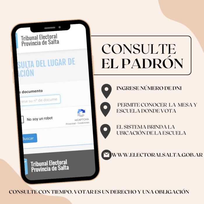 Para realizar la consulta, los interesados deben ingresar al sitio oficial del Tribunal Electoral de la Provincia de Salta https://www.electoralsalta.gov.ar/electores/consulta-lugar-votacion e introducir su número de documento y un código de validación.