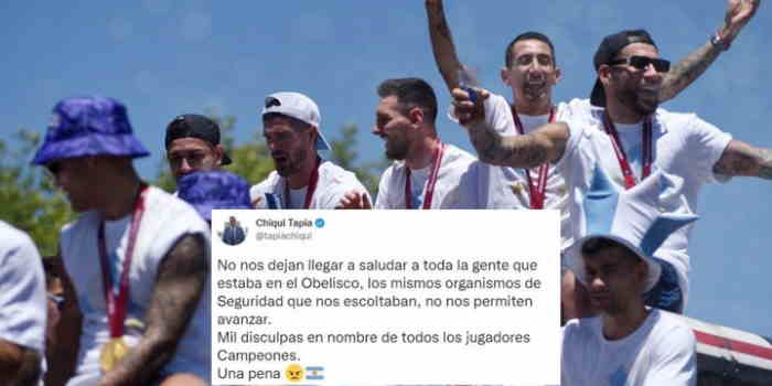 "Mil disculpas en nombre de todos los jugadores Campeones.Una pena 😠🇦🇷", cerró "Chiqui" Tapia en su publicación antes de que el micro con los jugadores se detuviera en Parque Roca para posteriormente abordar los helicópteros que sobrevolaron el microcentro de Capital Federal, y si bien pudieron observar a los hinchas, el clamor no fue el mismo.