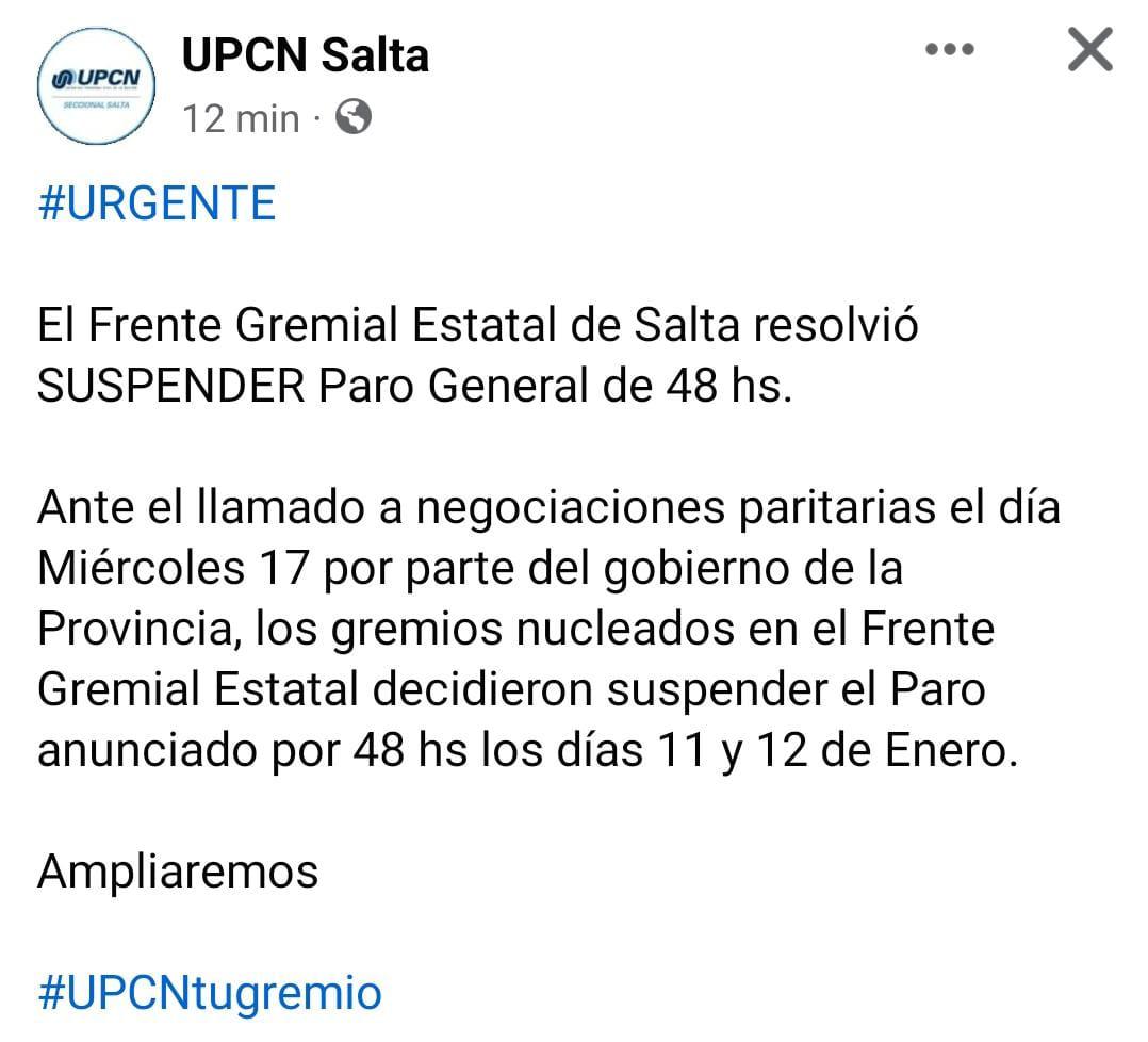 El Frente Gremial de Salta resolvió suspender el Paro provincial para este 11 y 12 de enero. Según informó por sus redes sociales UPCN Salta, la decisión es en respuesta al llamado a negociaciones paritarias del Gobierno.