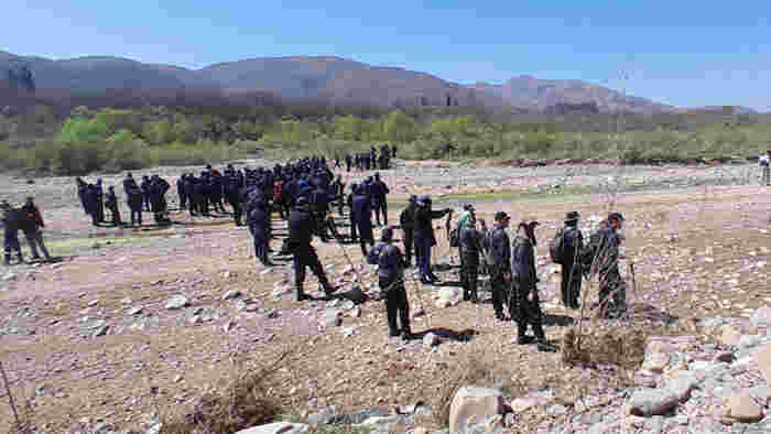 El secretario de Seguridad, Fernando Acedo y el jefe de Policía, Diego Bustos, presenciaron hoy el rastrillaje de uno de los sectores en los que se busca a Jésica Gutiérrez. Los acompañó Pedro Gutiérrez, familiar de la joven mujer quien falta de su hogar desde el 11 de septiembre pasado.