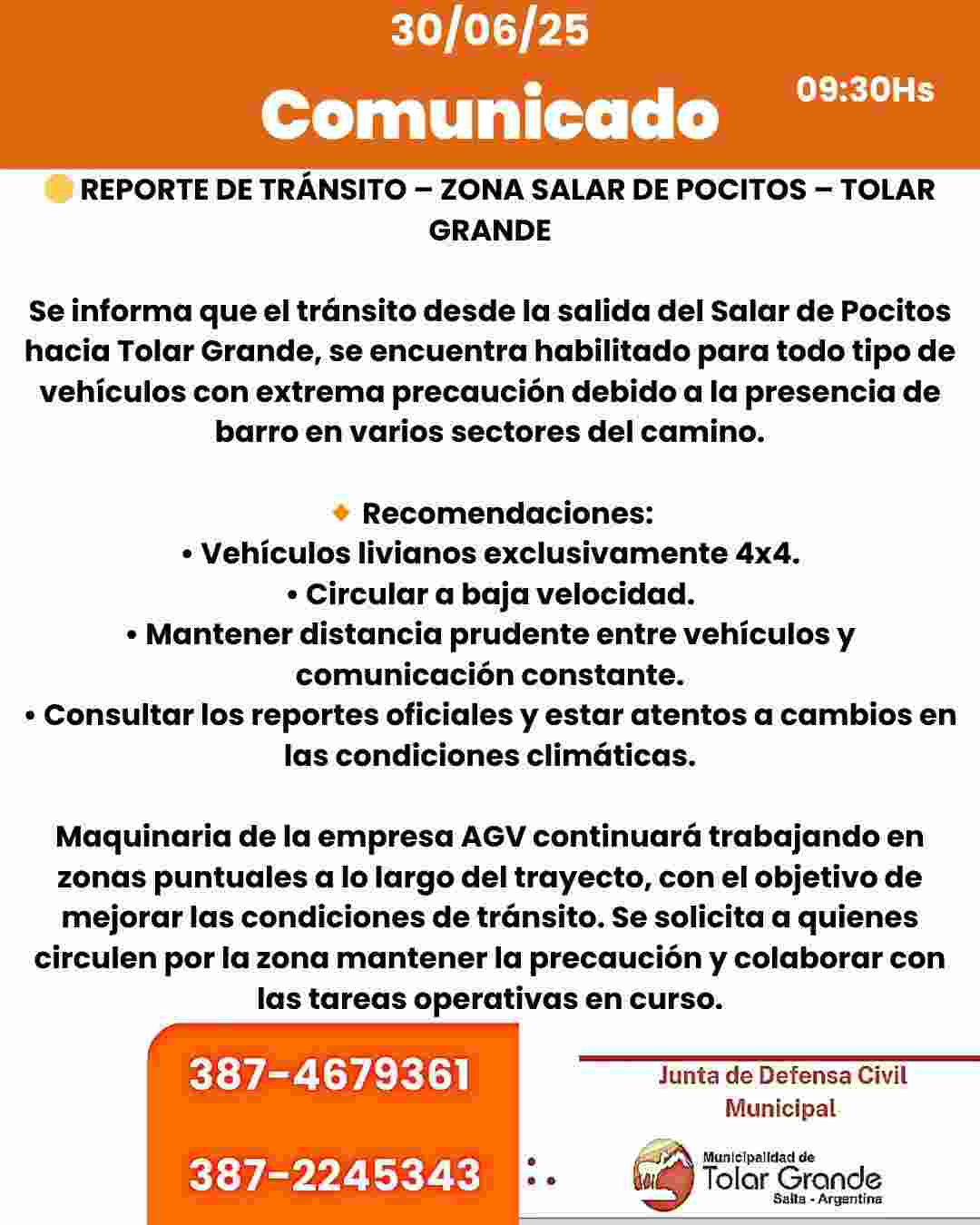 En plena temporada de actividad minera en la región del Salar de Pocitos, un nuevo informe emitido por la Junta de Defensa Civil Municipal de Tolar Grande advierte sobre las condiciones adversas del camino que une esa localidad con el estratégico punto de extracción. A partir de las 09:30 del lunes 30 de junio, las autoridades confirmaron que el tránsito hacia Tolar Grande se encuentra habilitado, aunque con serias advertencias debido a la presencia de barro en distintos tramos del recorrido.