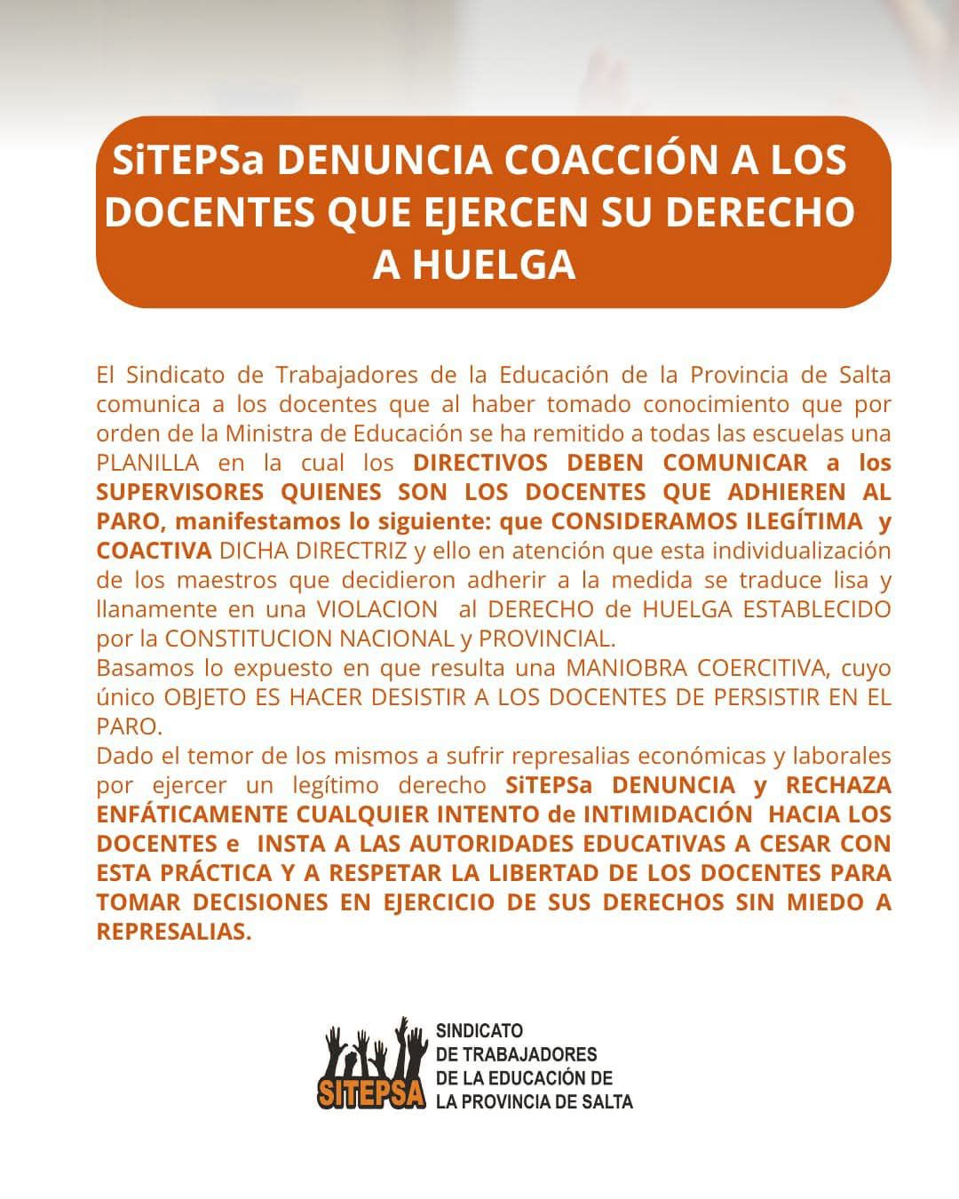 Mediante un comunicado, este lunes, SiTEPSa tomó conocimiento de una circular enviada a todas las escuelas, la cual exige a los directivos la confección de una planilla con los nombres de los docentes que se suman al paro. El sindicato consideró esta directriz ilegítima y coercitiva, interpretándola como una violación directa al derecho de huelga, amparado por las Constituciones Nacional y Provincial.