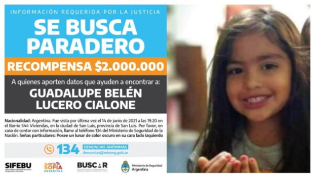 La Organización Internacional de Policía Criminal (Interpol), emitió hoy un alerta amarilla por Guadalupe Belén Lucero, la niña de 5 años que desapareció hace nueve días en el barrio 544 Viviendas, ubicado en la zona sur de la ciudad de San Luis.