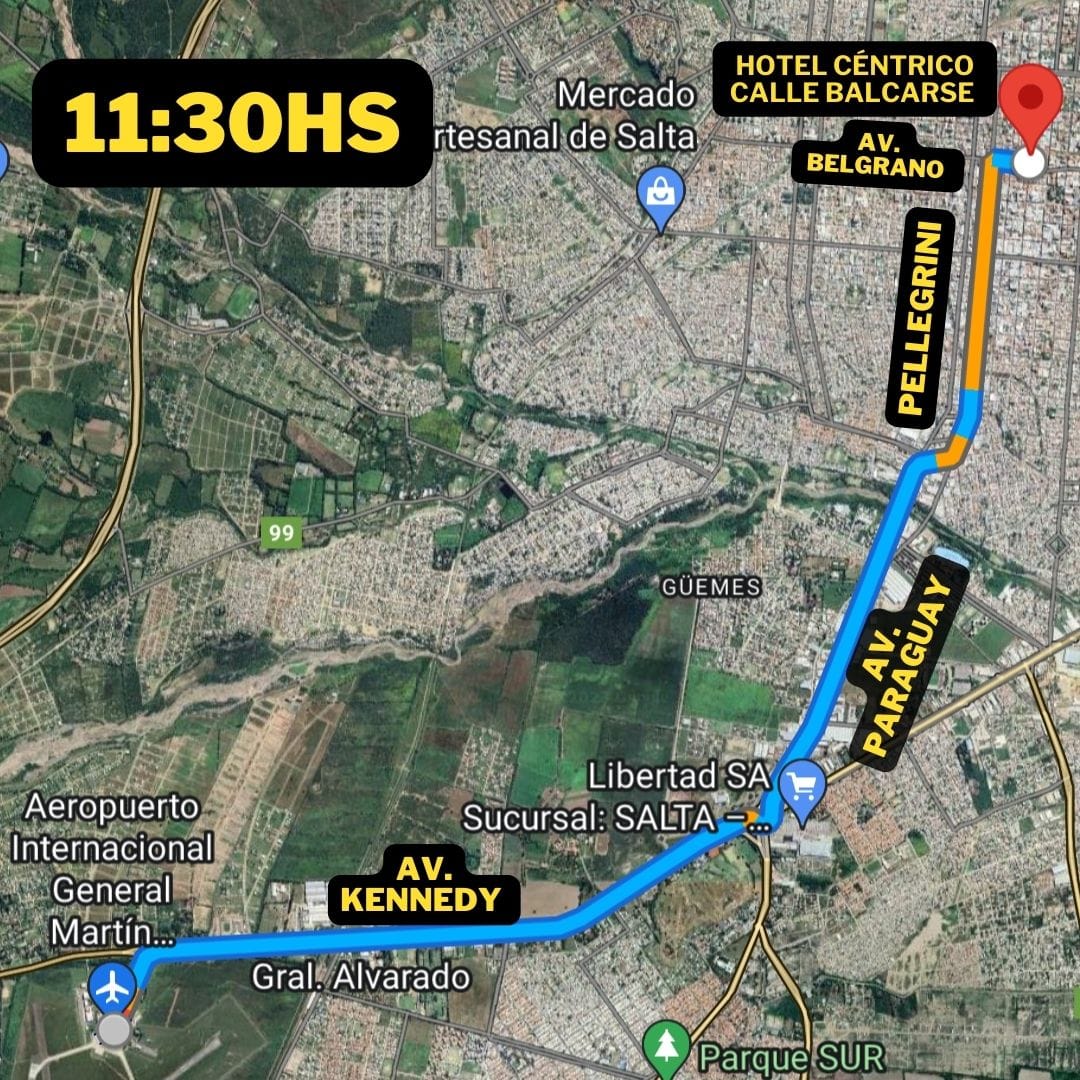 El recorrido iniciará en rotonda del Aeropuerto, av Kennedy, rotonda Limache, av Paraguay, Virgilio Tedín, Av Chile, calle Pellegrini, 25 de Mayo hasta Belgrano para finalizar en el hotel de calle Balcarce donde se lo recibirá con un banderazo.