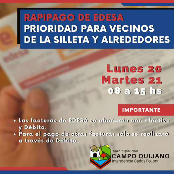El próximos lunes 20 y martes 21, el Rapipago de Edesa ubicado en Buenos Aires 265 dará prioridad/exclusividad a los vecinos de La Silleta y alrededores para el pago de facturas. Por ello en la delegación municipal se emiten permisos de circulación exclusivos para esos días.