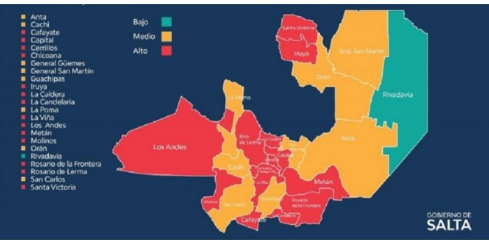En los de mediano riesgo, considerados zonas con transmisión local por conglomerados con brotes controlados, se incluye a Guachipas, La Poma, San Martín, General Güemes, San Carlos, Orán, Anta, y Cachi.