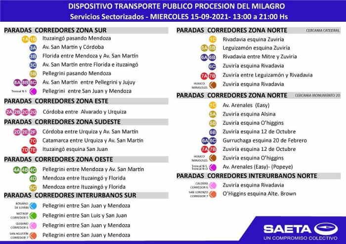 En el marco de la celebración de la Solemnidad del Señor y la Virgen del Milagro, SAETA estableció la ubicación de las paradas de cada línea urbana y metropolitana para el miércoles 15 de septiembre día en que se desarrollará la procesión con las sagradas Imágenes.