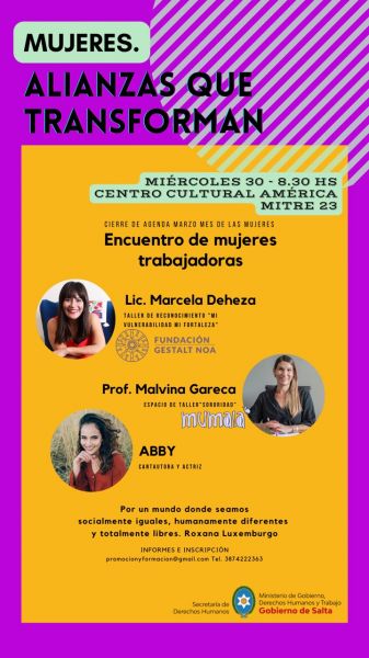 El encuentro comprende espacios de talleres participativos a cargo la licenciada Marcela Deheza de la Fundación Gestalt Noa y, otro a cargo del equipo de formación Mumala Salta con la coordinación de la concejala y referente, Malvina Gareca para trabajar en herramientas y conceptos sobre el reconocimiento personal, habilidades para la vida y la sororidad además de acciones preventivas de las violencias. La jornada también contará con la presentación artística de la cantautora y actriz ABBY. La propuesta cuenta con el acompañamieto de la Secretaría de Cultura de la Provincia.