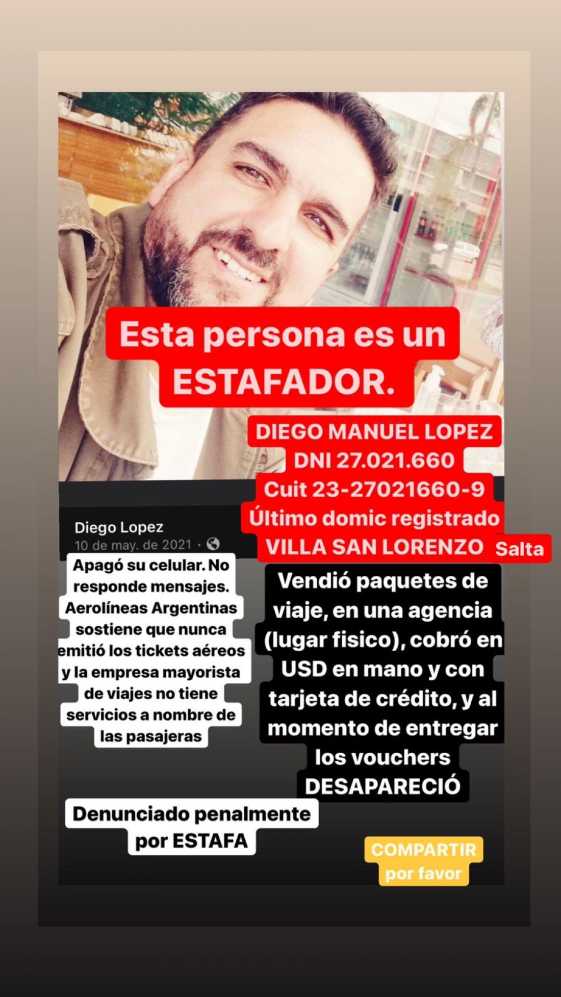 Desde ese momento, Diego López, está desaparecido, apagó su celular y las bloqueó de Facebook y WhatsApp. Preocupadas por la situación, Florencia y su amiga llamaron a Aerolíneas Argentinas, en donde les informaron que sus vuelos nunca fueron emitidos, también llamaron a los hoteles y tampoco tienen reservas a sus nombres.