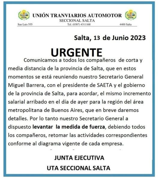 La noticia fue ratificada por el secretario general de UTA Salta, Miguel Barrera. "El restablecimiento del servicio de corta y media distancia será paulatino. Se estima que Saeta logrará restablecer los recorridos cerca del mediodía".