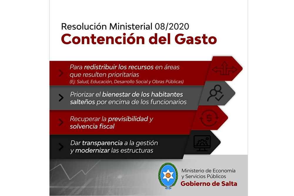 El Ministerio de Economía y Servicios Públicos, mediante la Resolución N° 08/2020, dispuso la contención de gastos y redistribución de recursos del Estado provincial, a fin de priorizar el bienestar de los habitantes salteños, por encima de los funcionarios públicos.