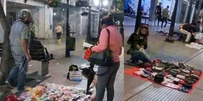 Nuevamente se pudo ver la presencia de algunos manteros en las peatonales después del horario de cierre de los comercios y cuando ya no patrullan los jóvenes de Prevención y Emergencias.